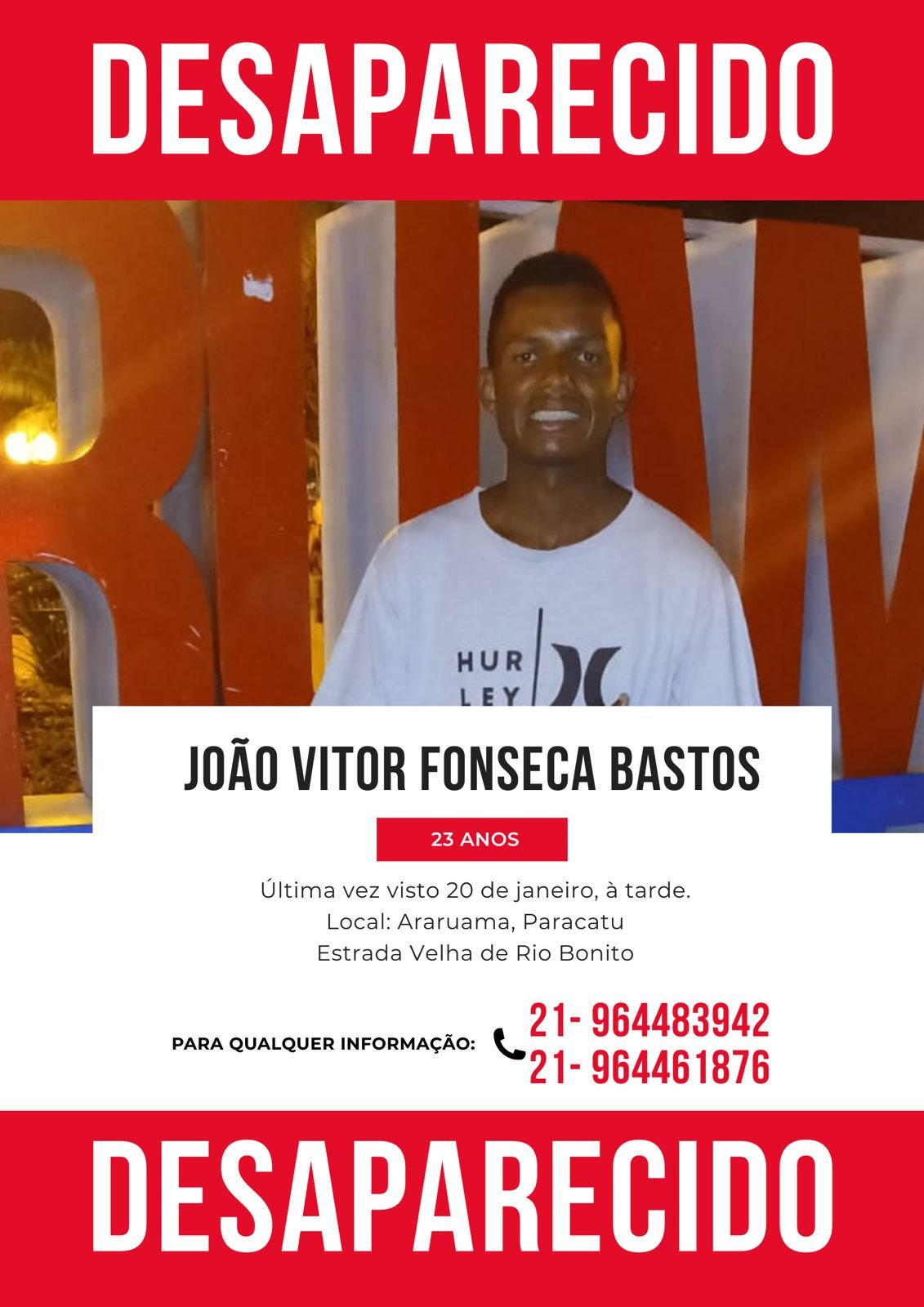 Desapareceu na tarde desta quinta-feira, por volta das 17h30, na Estrada Velha de Rio Bonito, em Paracatu, Araruama, o jovem João Vítor Fonseca Bastos, de 23 anos, que é autista. Ele estava vestindo camiseta verde, bermuda preta, boné vermelho e carregava uma mochila. Natural do Méier, Rio de Janeiro, mais especificamente da região de Lins de Vasconcelos, Rua Marcílio Dias, sua família pede por informações que possam ajudar a localizá-lo.